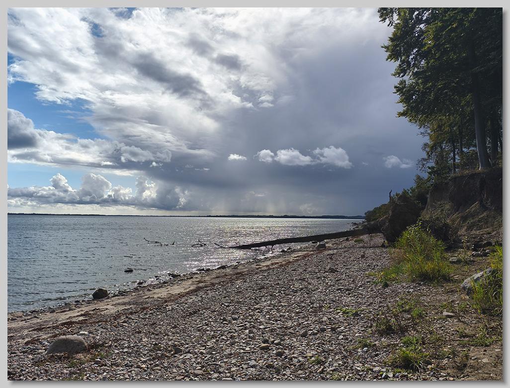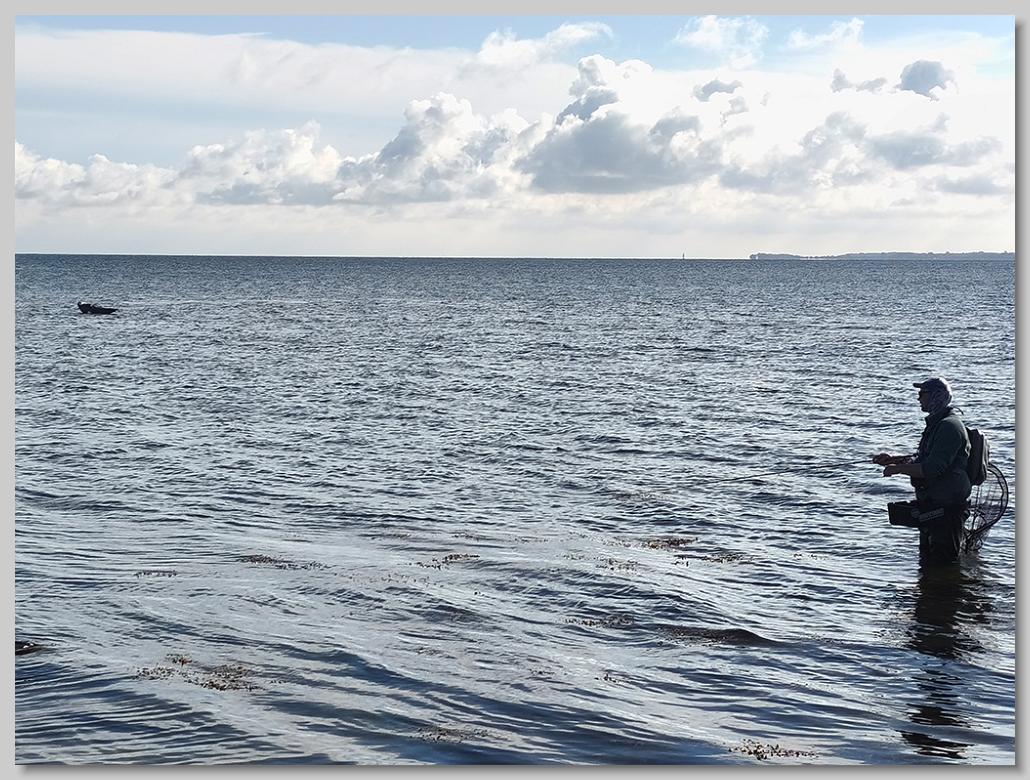 Als dann drei Mitstreiter am Ufer auftauchten, war für uns klar, dass wir den Spot wechseln sollten. Nicht die schlechteste Idee angesichts der Wolkenwand, die aufzog. Und weil Jens einer leichten Fleecejacke gegenüber der Watjacke am frühen Morgen den Vorzug gegeben hatte, genau die richtige Entscheidung.