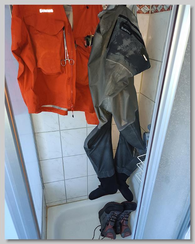 Nach zweieinhalb Stunden auf der Bahn, vor dem verdienten Feierabendbierchen, Tacklepflege. Wie immer gab es reichlich Süsswasserdusche für Wathose, Jacke und Stiefel.....